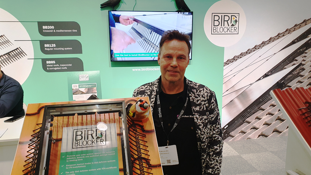 Allt på Elmia Solar 2026 är inte stora, blänkande solceller utan det finns även stödsystem som är lika viktiga för funktionen. Birdblocker är en holländsk produkt som hindrar fåglar och ekorrar att krypa in under solpanelerna och bygga bo och gnaga på kablaget. Så här säger Anders Sjöstrand, svensk representant: